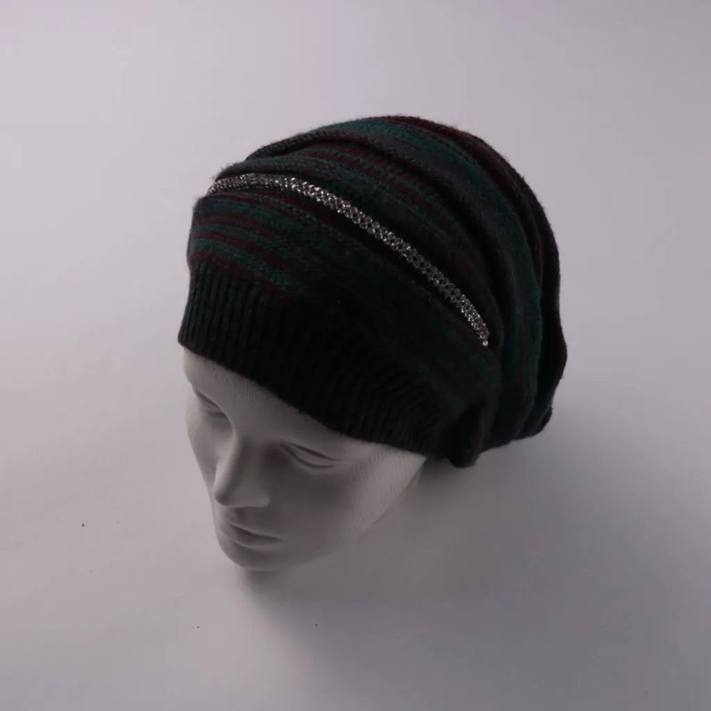 Вязаная шапка без бренда с полосатым рисунком и декоративной блестящей вставкой спереди. Подойдёт для повседневной носки в холодную погоду и в городе, и на прогулках. Плотная вязка хорошо защищает голову от ветра и сохраняет тепло.