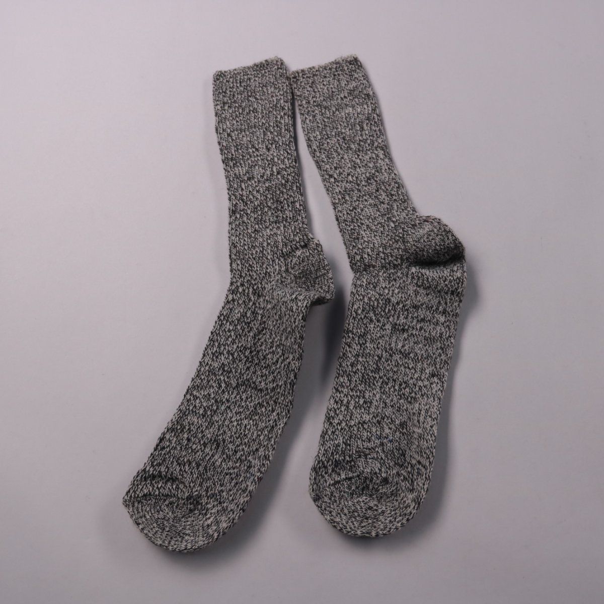 Вязаные носки серого меланжа без видимого бренда, средней/плотной вязки. Подойдут для холодной погоды и повседневной носки с ботинками или кроссовками. Плотная пряжа помогает лучше сохранять тепло.