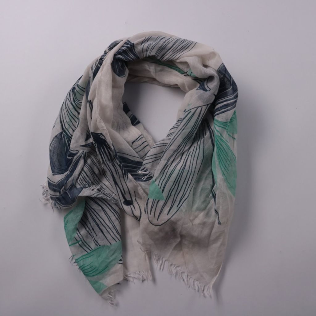 Лёгкий шарф с цветочным принтом и небольшой бахромой по краям. Подойдёт для повседневных образов и как накидка на плечи в прохладную погоду. Тонкая ткань удобно складывается и не занимает много места в сумке.