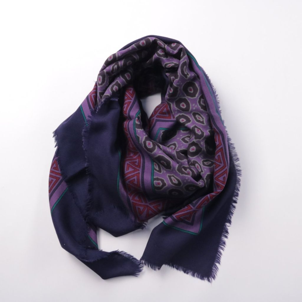 Шарф с геометрическим узором в сине-фиолетовой гамме и бахромой по краям. Подойдёт для повседневных образов и в офис, можно носить на шее или накидывать на плечи. Легко складывается и занимает мало места в сумке.