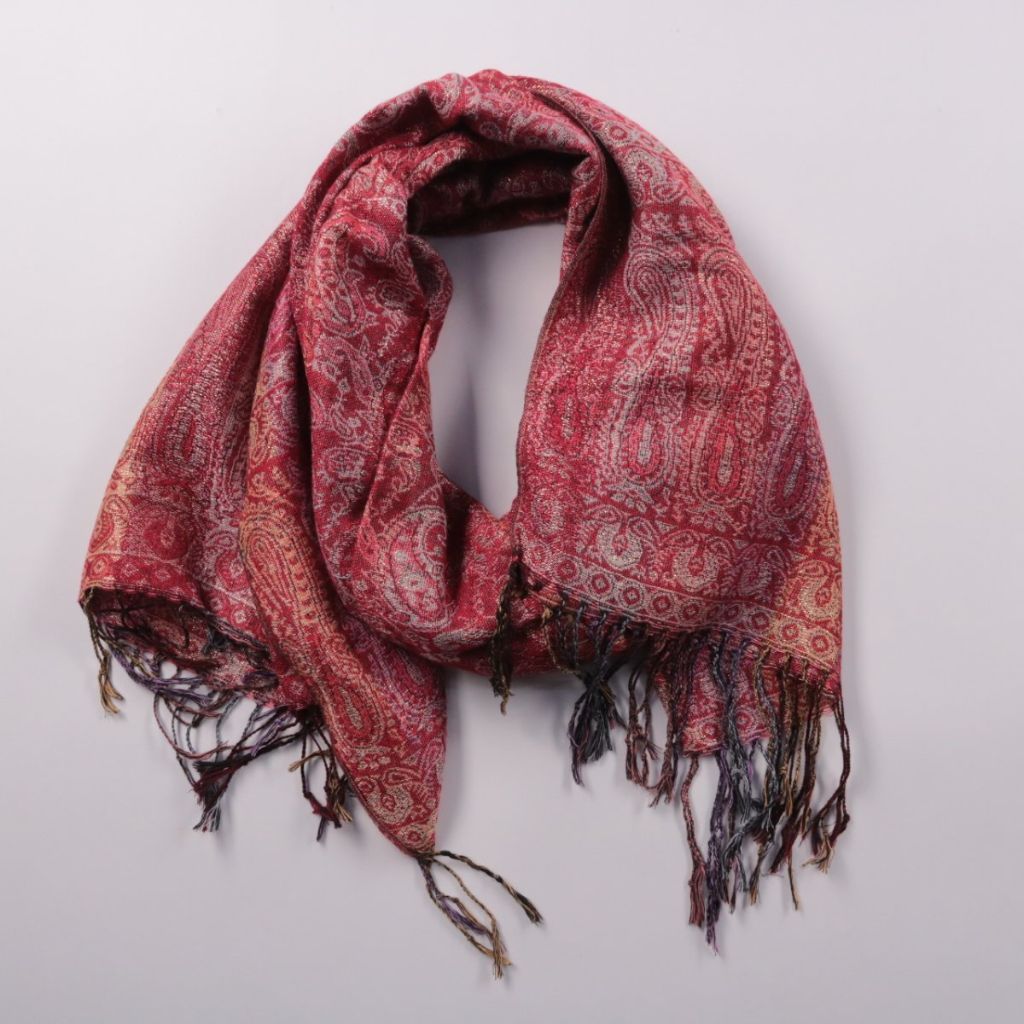 Шарф с орнаментом пейсли и кисточками по краям. Подойдёт для демисезонных образов и как акцент к пальто или куртке. За счёт мягкой ткани легко драпируется и удобно завязывается.