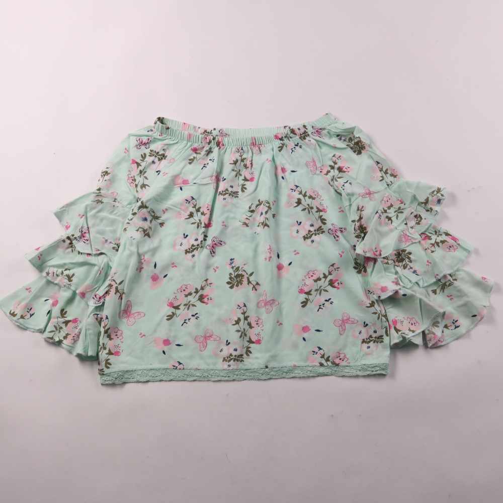 Детская блузка Epic Threads мятного цвета с цветочным принтом и бабочками, с открытыми плечами и рукавами-воланами. Подойдёт для летних прогулок и праздников. Лёгкая вискоза хорошо дышит и быстро сохнет после стирки.
