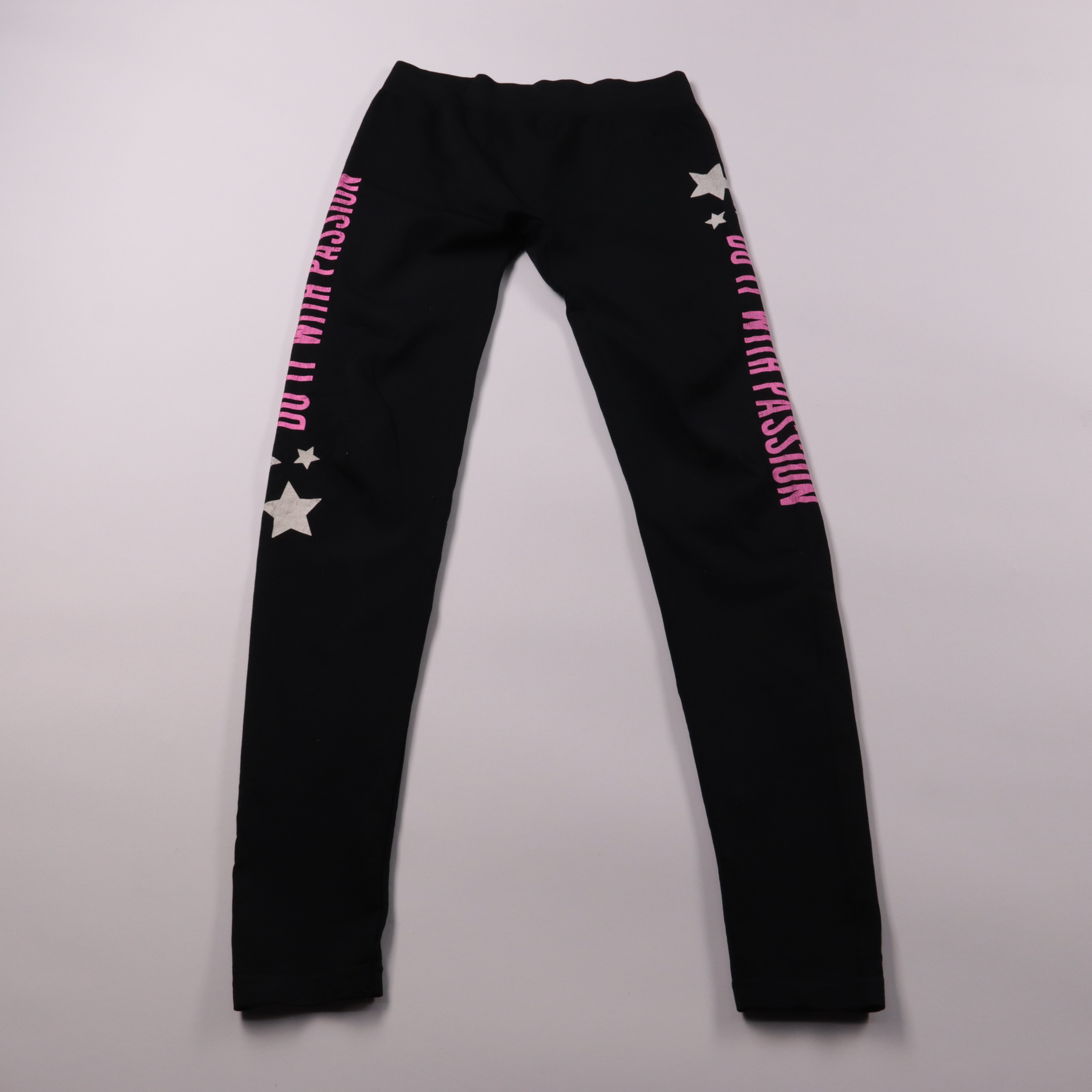 Легинсы Page one чёрного цвета с розовыми надписями и принтом со звёздами по бокам. Подойдут для школы, прогулок и тренировок, хорошо сочетаются с худи и футболками. Эластичный материал удобно тянется и не стесняет движений.