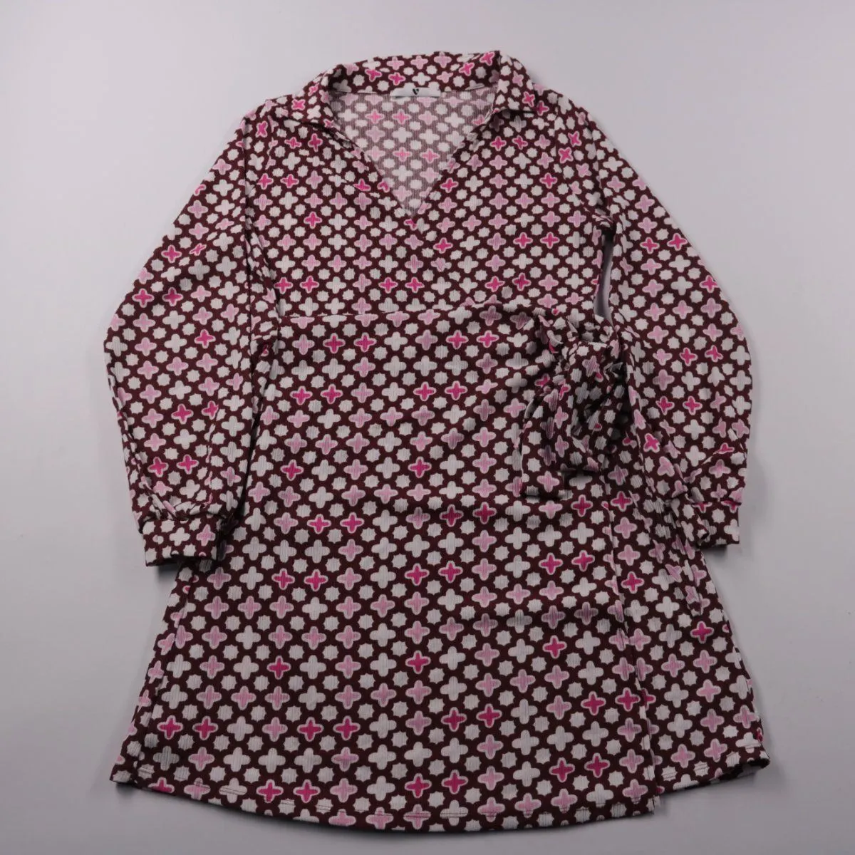 Платье Very для девочки с длинным рукавом и геометрическим принтом, с запахом и поясом на завязках сбоку. Подойдёт для школы, прогулок и праздников, хорошо сочетается с колготками и кардиганом. Ткань тянется за счёт эластана и удобно садится по фигуре.