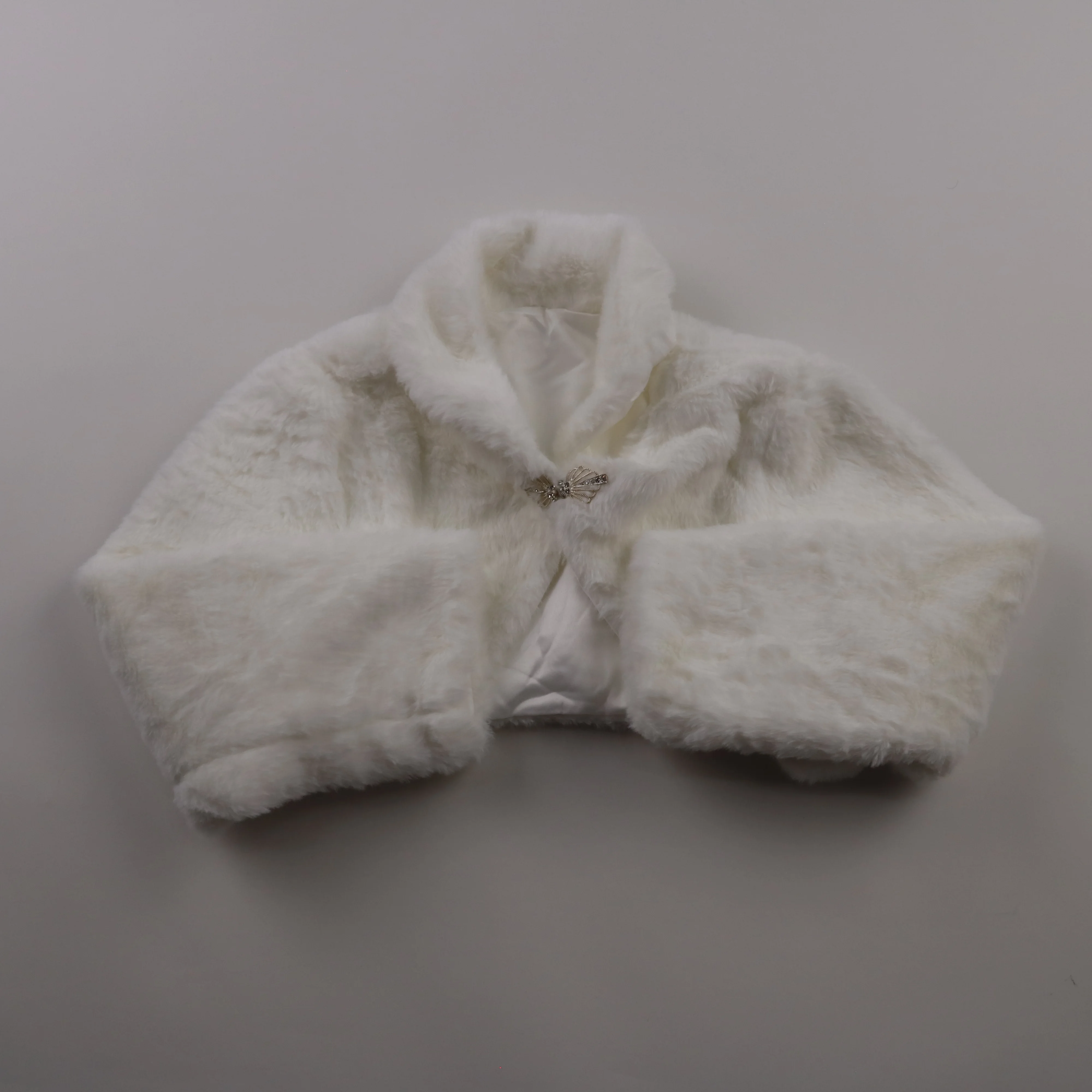 Детский меховой жилет (болеро) белого цвета с декоративной застёжкой спереди. Подойдёт для праздников и фотосессий, можно накинуть поверх платья или нарядного костюма. Мягкий ворс и подкладка делают вещь комфортной в носке.