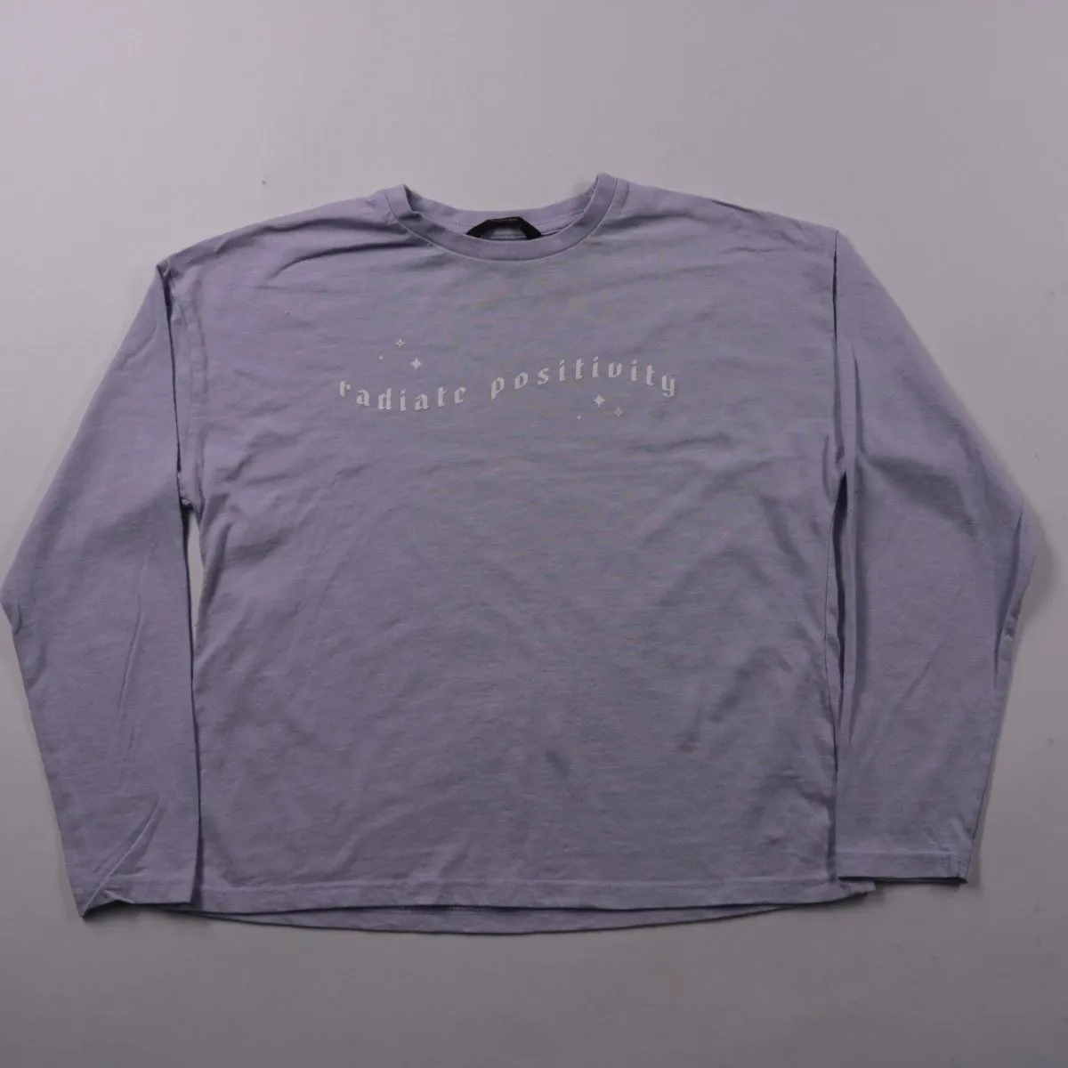 Лонгслив (кофта) George лавандового цвета с надписью Radiate positivity. Подойдёт девочке на 11–12 лет (рост 146–152) для школы и прогулок в прохладную погоду. Мягкий трикотаж приятен к телу и легко стирается.