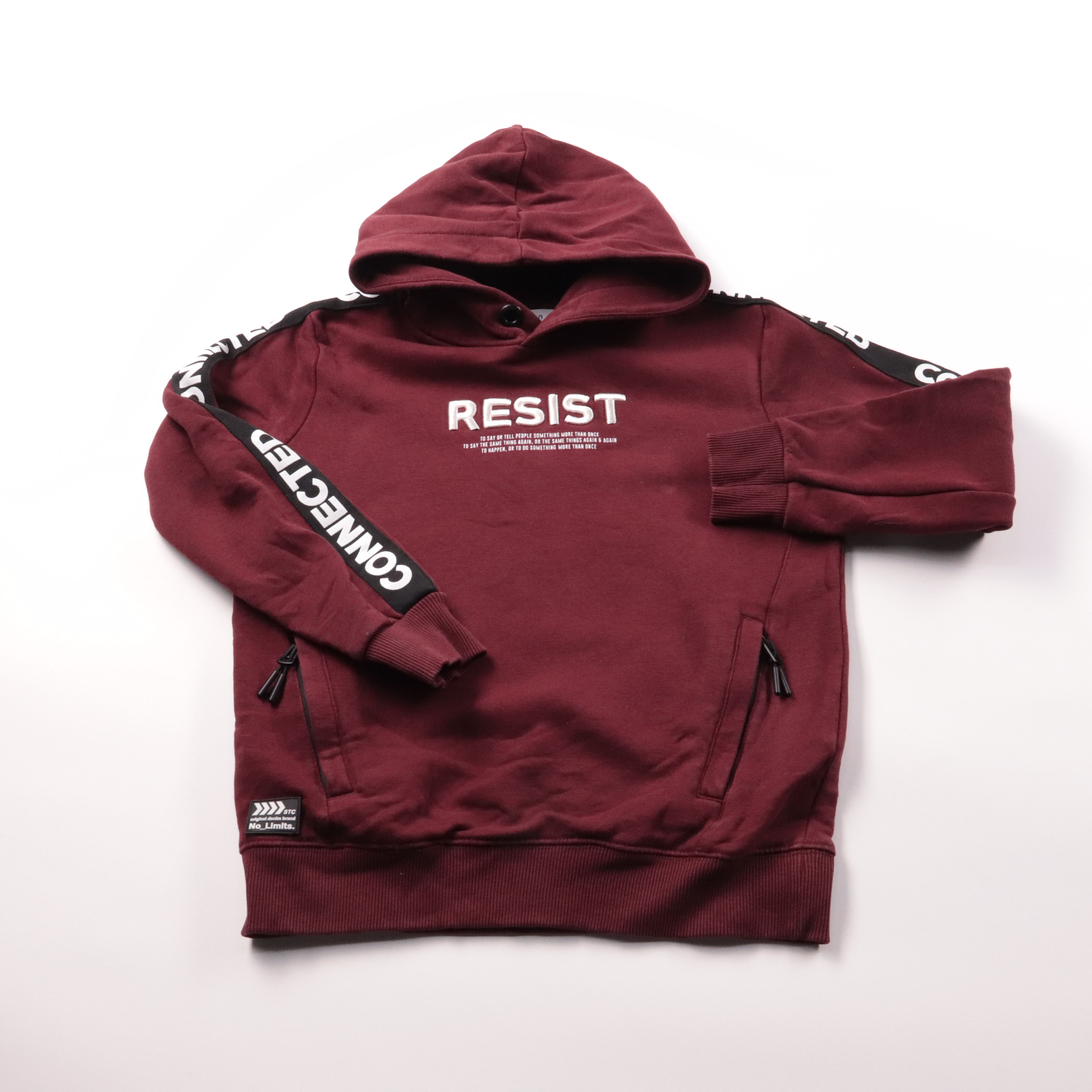 Толстовка-худи STC бордового цвета с капюшоном и надписью RESIST, по рукавам декоративные ленты CONNECTED. Подойдёт для школы и прогулок в прохладную погоду. Есть удобные карманы на молниях.