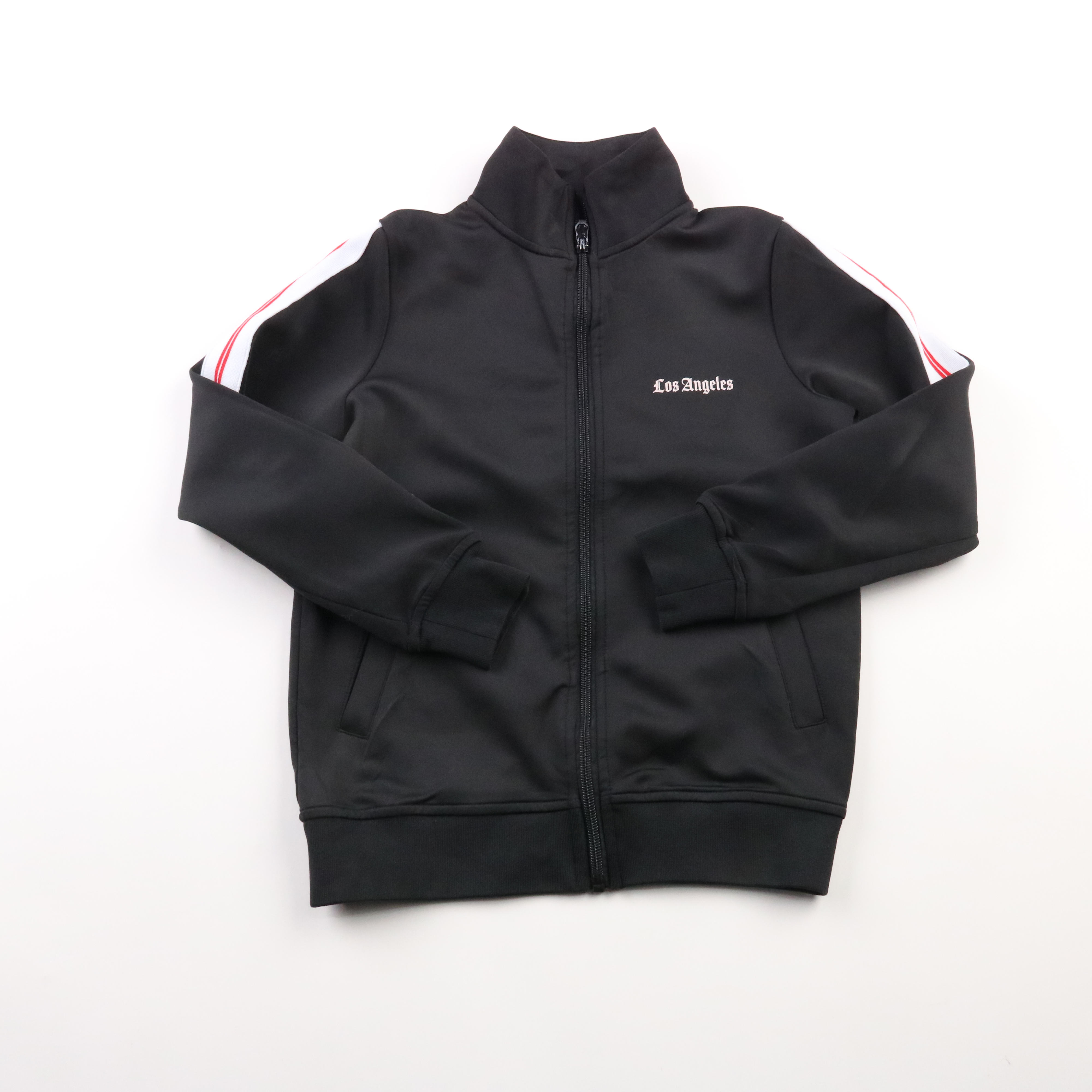Толстовка Chapter Young на молнии, чёрного цвета, с воротником-стойкой и надписью Los Angeles на груди. Подойдёт для школы, прогулок и тренировок в прохладную погоду. Практичный материал легко стирается и быстро сохнет, есть карманы для мелочей.