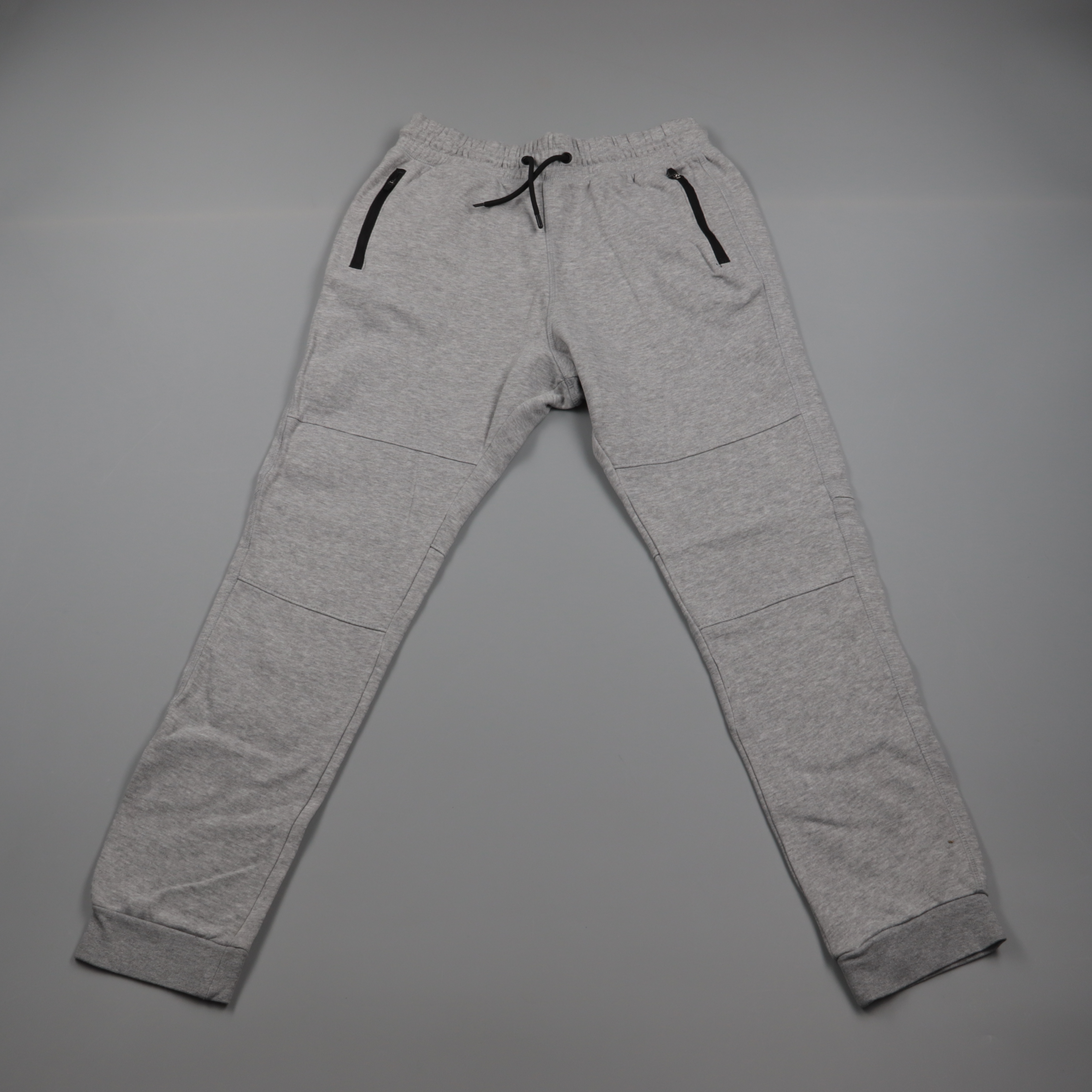 Мужские спортивные брюки H&M Skinny Fit серого меланжа с эластичным поясом на шнурке и карманами на молниях. Подойдут для повседневной носки, прогулок и дороги. Манжеты снизу помогают брюкам аккуратно сидеть и не задираться.