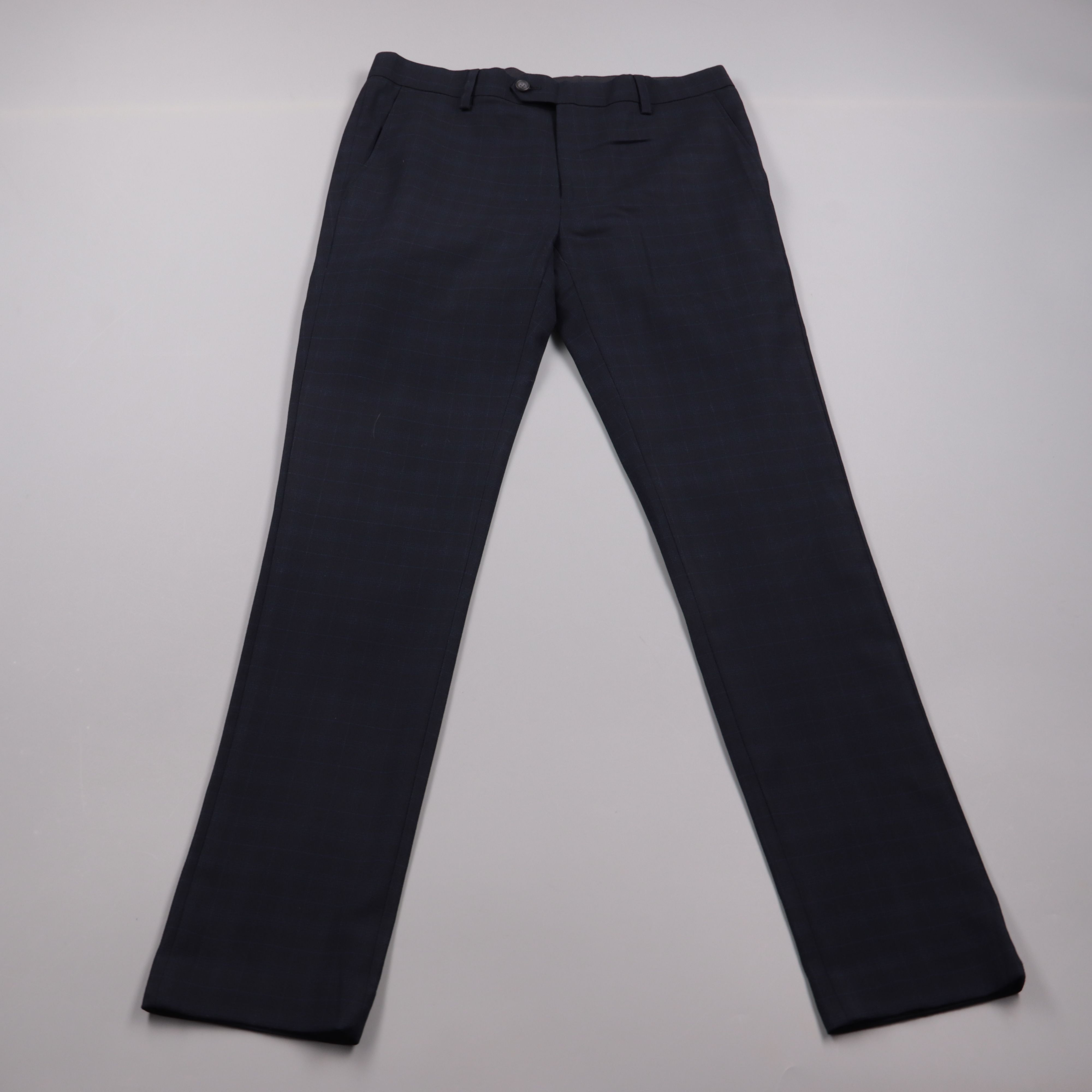 Мужские классические брюки Next тёмно-синего цвета в лёгкую клетку, со стрелками и шлёвками под ремень. Подойдут для офиса, собеседований и повседневных образов в стиле smart casual. Практичны тем, что ткань с эластаном немного тянется и комфортно сидит.