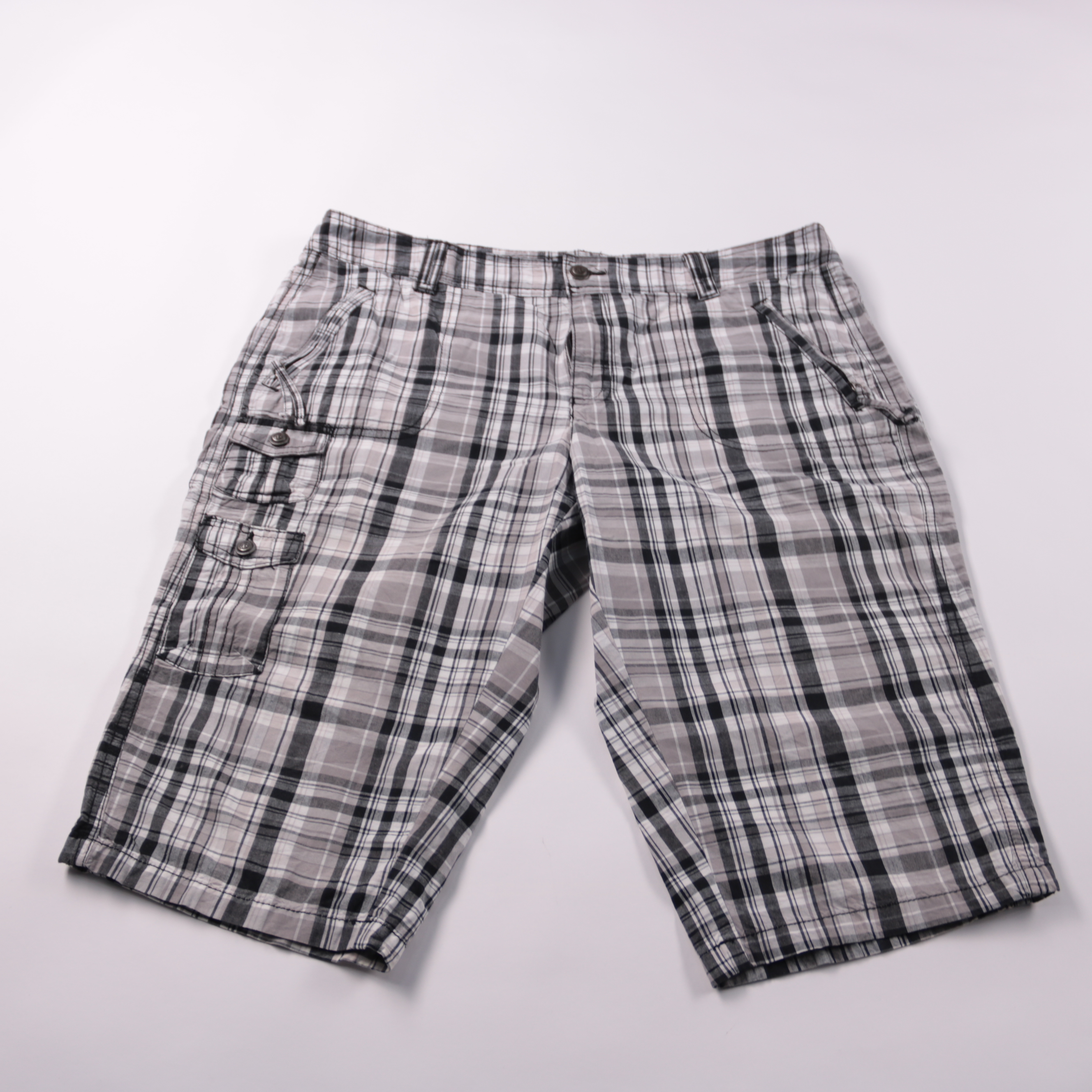 Клетчатые шорты карго Yessica в серо-чёрной гамме, с боковыми и накладными карманами на кнопках. Подойдут для повседневной носки, прогулок и поездок в тёплую погоду. Практичный плюс — вместительные карманы для мелочей.