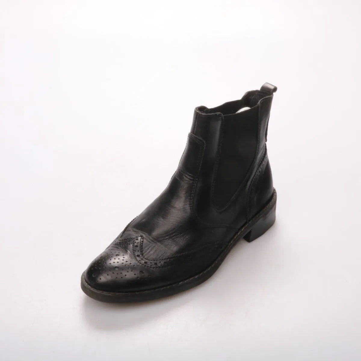 Женские ботильоны из натуральной кожи в чёрном цвете, с эластичными вставками по бокам и декоративной перфорацией на мысе. Подойдут на каждый день в демисезон, хорошо сочетаются с джинсами и платьями. Устойчивый невысокий каблук делает пару удобной для длительной ходьбы.