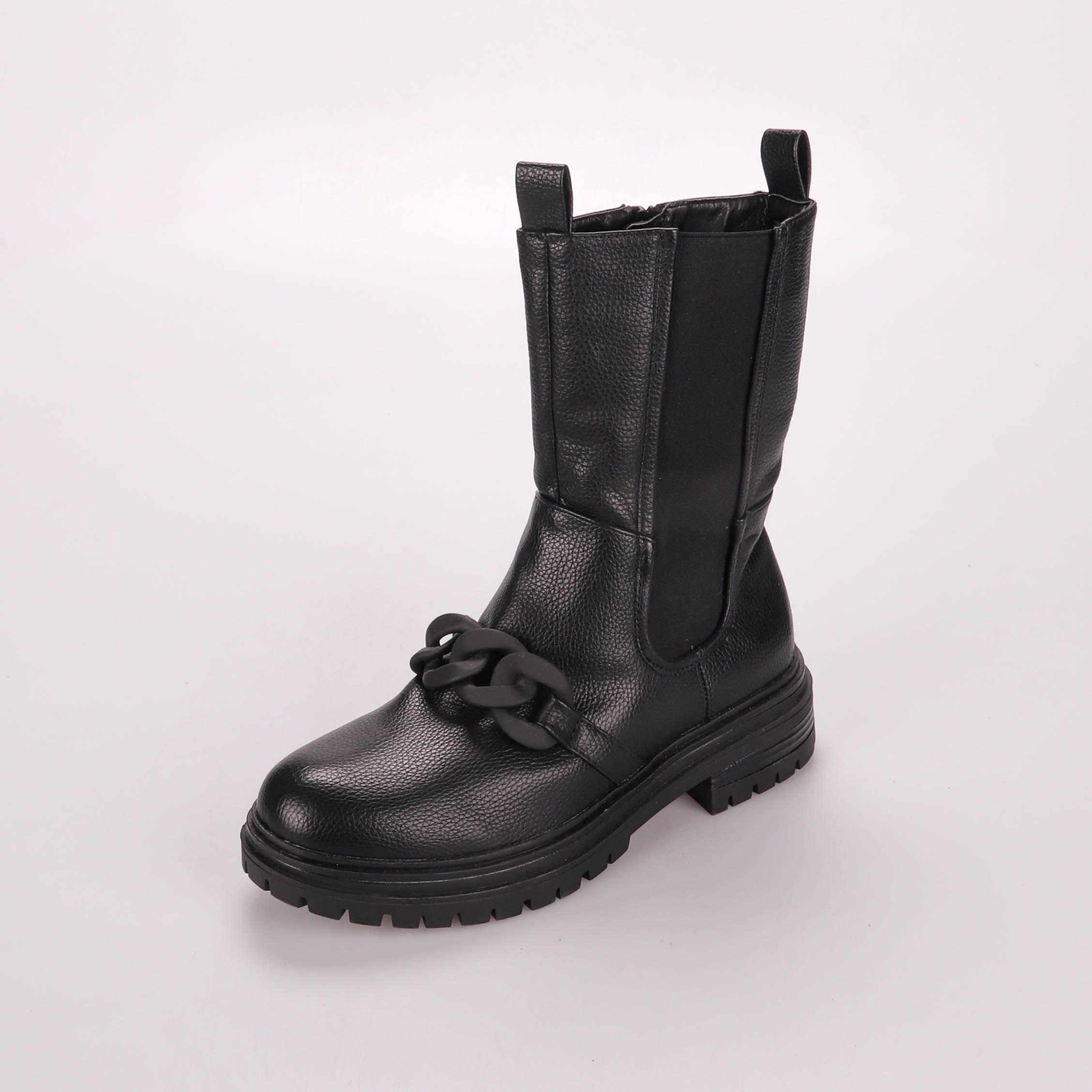 Женские ботинки из чёрной фактурной эко-кожи с декоративной цепью и массивной тракторной подошвой. Удобны для повседневной носки в демисезон и хорошо сочетаются с джинсами, платьями и пальто. Молния сбоку и петли на голенище помогают быстро обуваться.