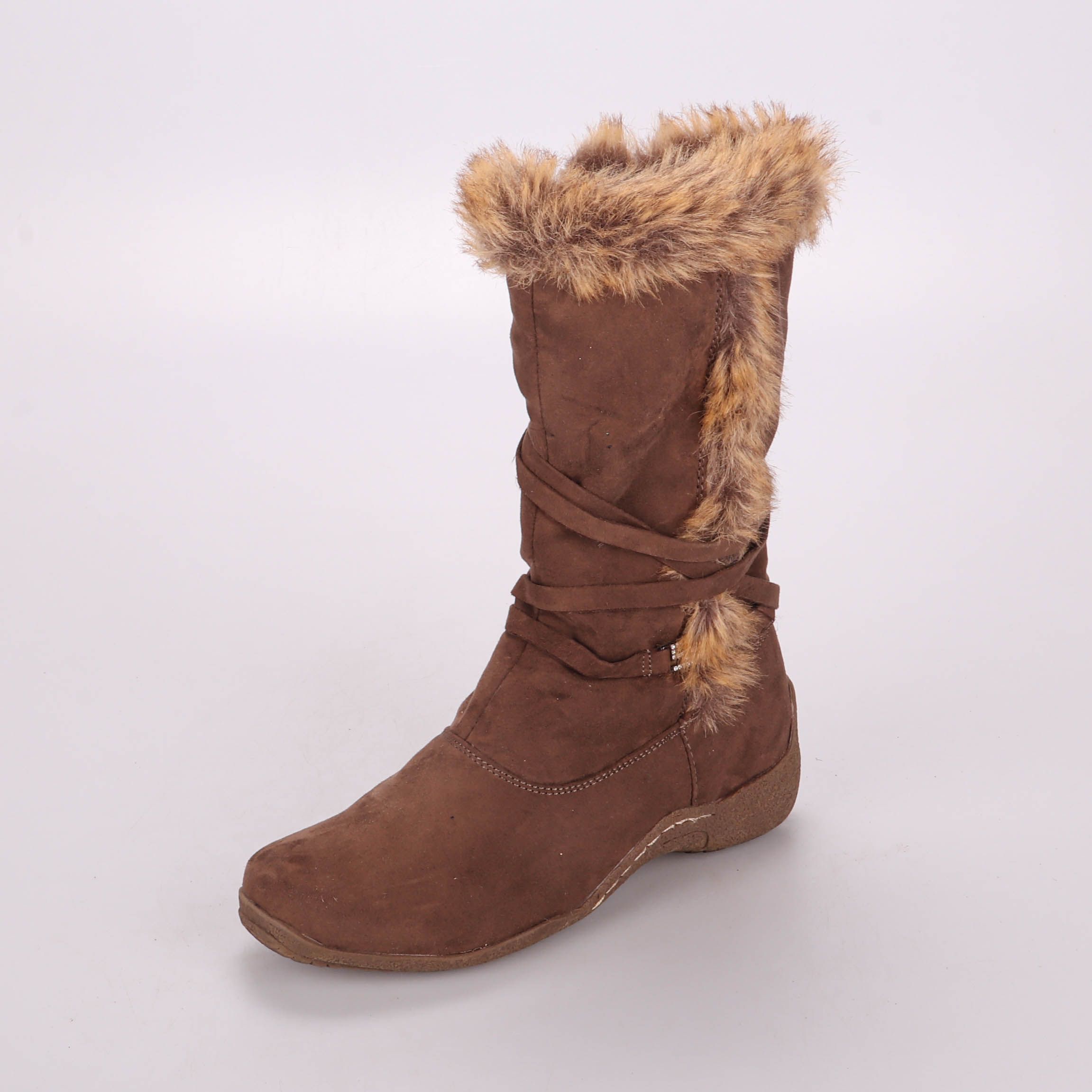 Женские зимние сапоги из коричневой замши с меховой опушкой и декоративными ремешками. Удобная молния сбоку помогает быстро надевать обувь, а рельефная подошва лучше держит на скользкой дороге.