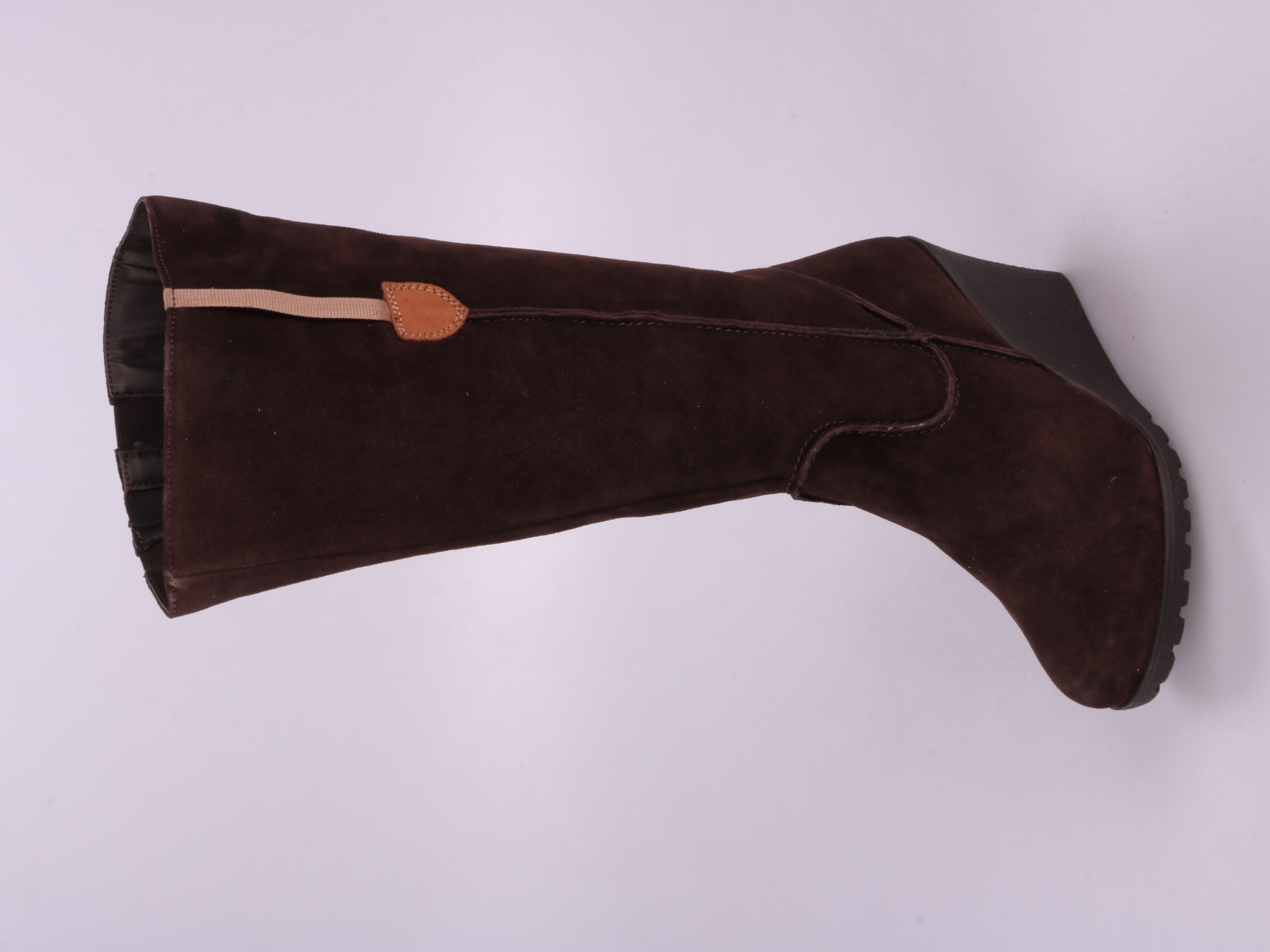 Высокие сапоги Sheego из тёмно-коричневой замши на устойчивой танкетке. Подойдут для повседневной носки в прохладную погоду и легко сочетаются с джинсами и платьями. Молния сбоку помогает быстро надевать и снимать обувь.