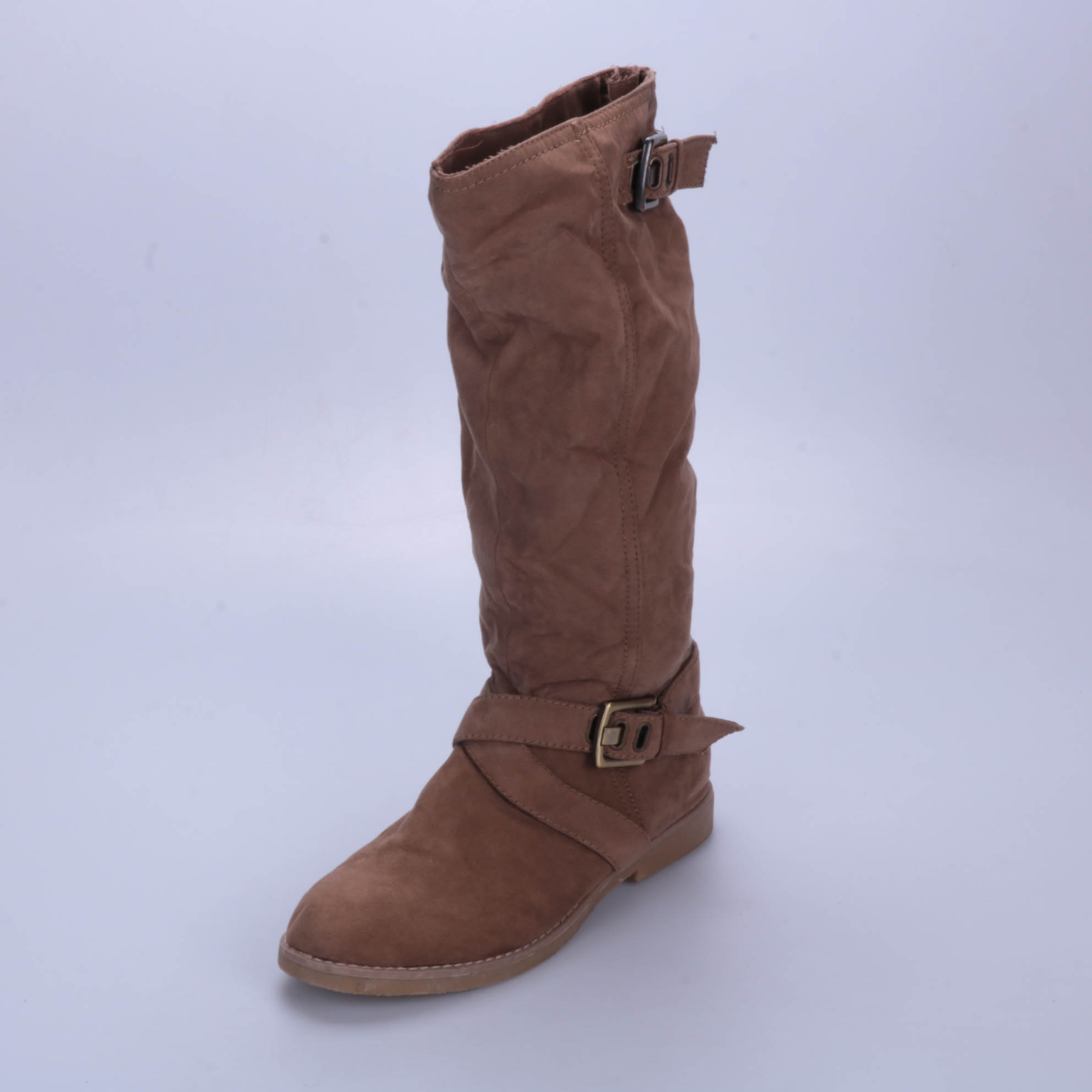 Женские сапоги Graceland коричневого цвета из искусственной замши, с декоративными ремешками и молнией сбоку. Подойдут для повседневных образов в прохладную погоду с джинсами или платьями. Мягкая подкладка и плоская подошва делают их удобными для длите...