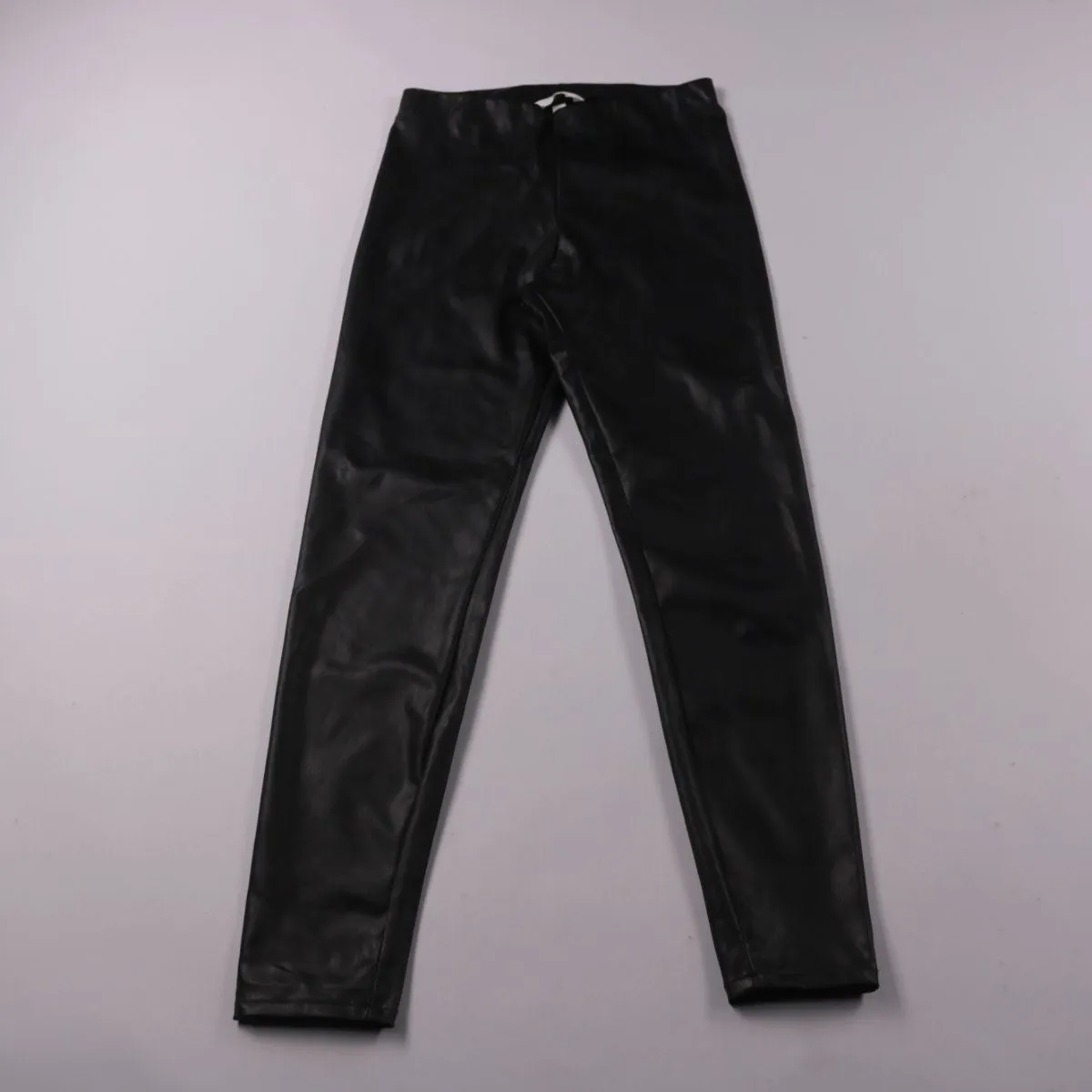 Женские брюки-легинсы H&M из материала под кожу, чёрного цвета. Подойдут для повседневных образов в прохладную погоду и для выхода вечером. Практичны тем, что легко протираются и не требуют сложного ухода.