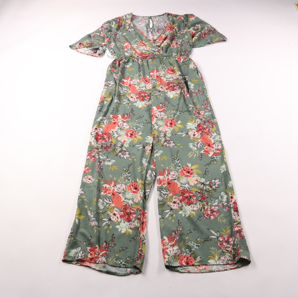 Женский комбинезон Band of Gypsies с цветочным принтом на серо-зелёном фоне, короткими рукавами и запахом на груди. Подойдёт для лета и отдыха, хорошо смотрится с босоножками или кедами. Лёгкая ткань и свободные брючины дают комфорт и не сковывают движ...