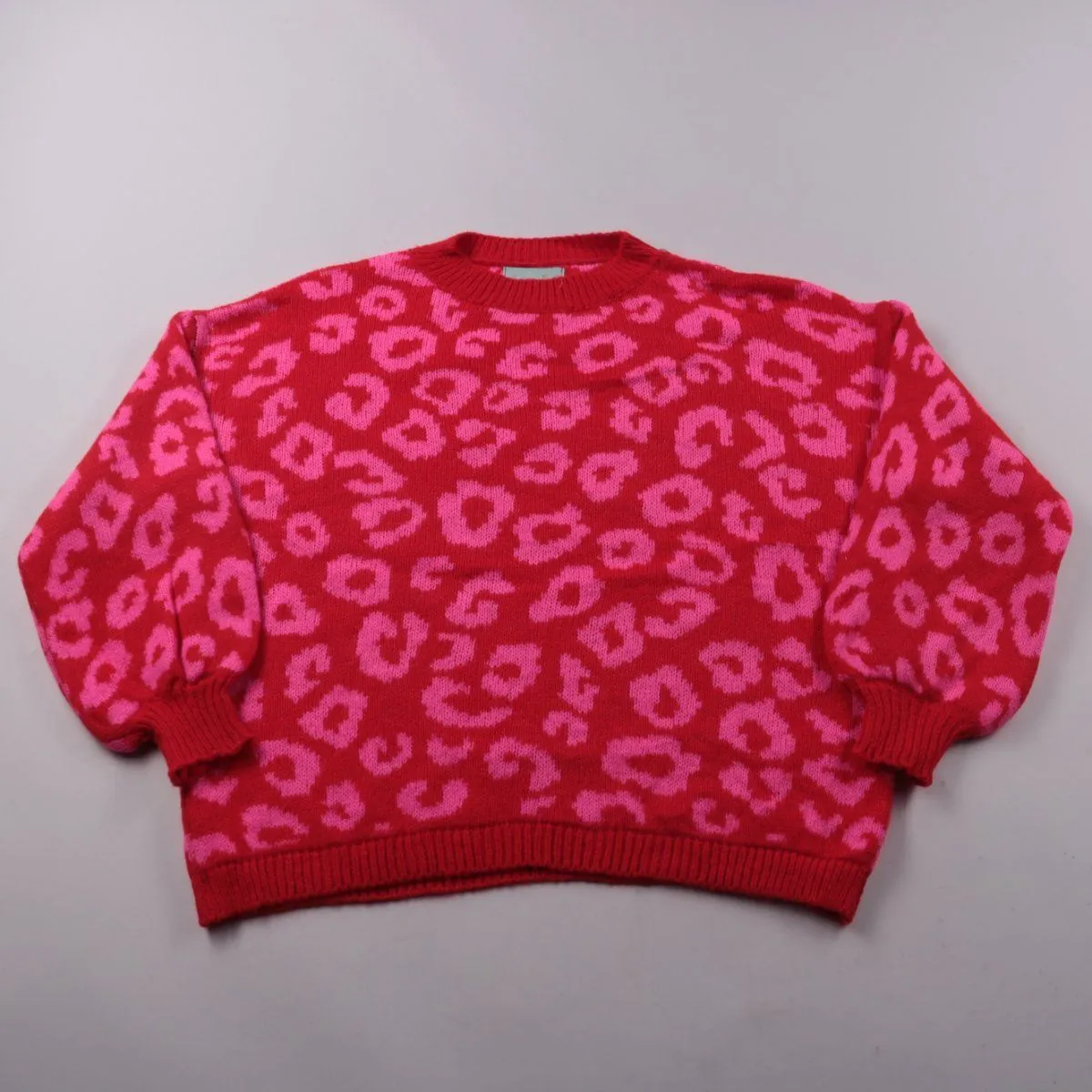 Вязаный свитер с леопардовым узором в красно-розовой гамме, без застёжек, с круглым вырезом. Подойдёт для повседневных образов в прохладную погоду и удобно сочетается с джинсами или юбкой. Смесь шерсти и альпаки в составе добавляет тепла при носке.