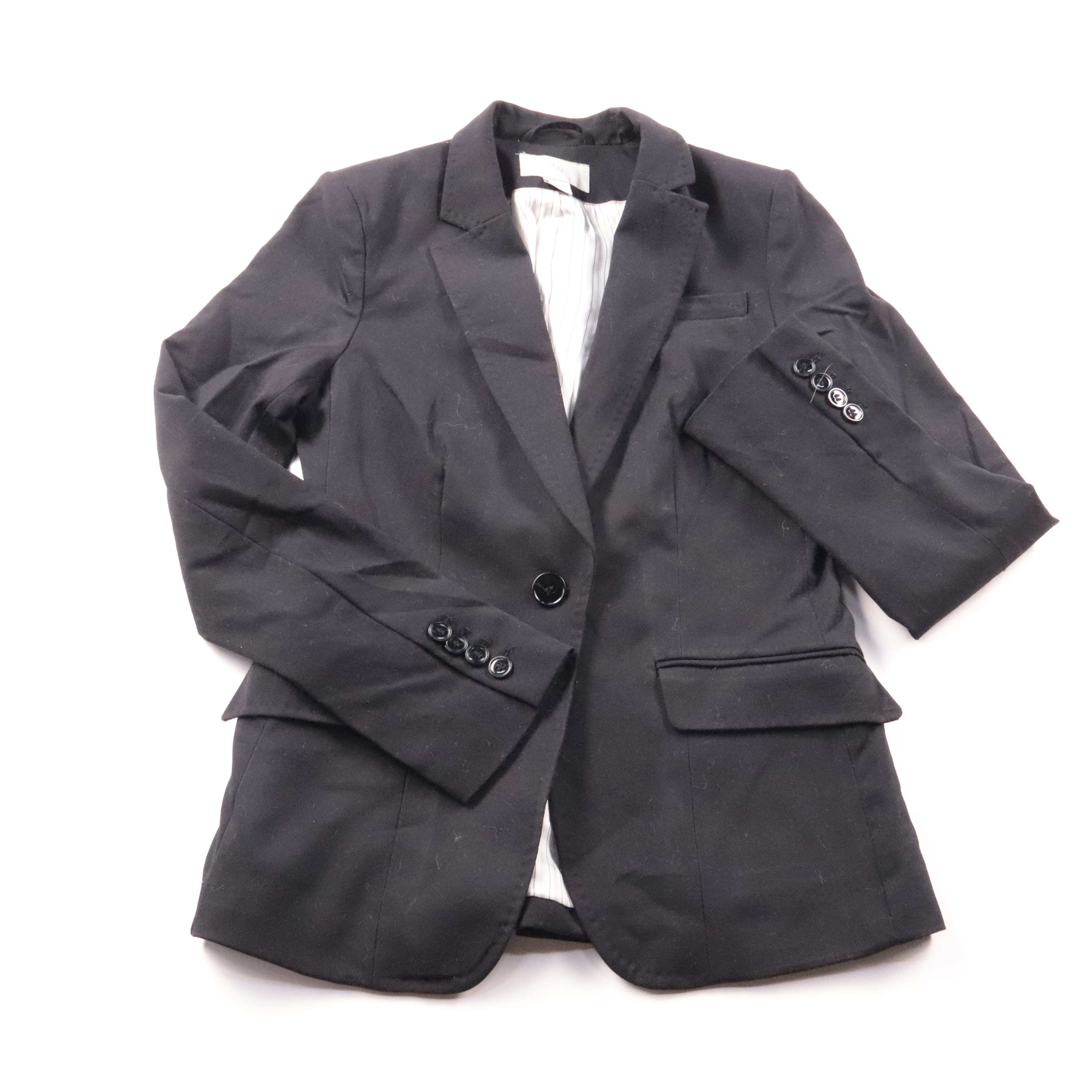 Женский классический пиджак H&M чёрного цвета, однобортный на одну пуговицу, с лацканами и карманами с клапанами. Подойдёт для офиса, собеседований и деловых встреч, легко сочетается с брюками, юбкой или джинсами. Ткань с добавлением эластана даёт немн...