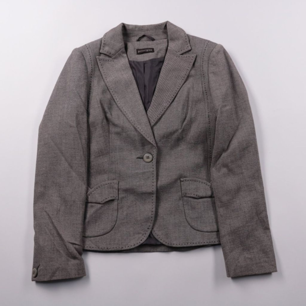 Женский приталенный пиджак Principles серого цвета с аккуратной отделочной строчкой и накладными карманами. Подойдёт для офиса и деловых встреч, легко сочетается с брюками и юбками. Практичное преимущество — немнущаяся смесовая ткань и подкладка для ко...