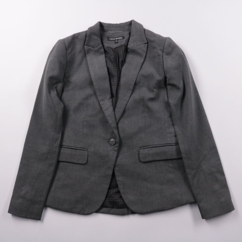 Женский приталенный пиджак Next Petite в тёмно-сером цвете, на одной пуговице, с лацканами и клапанами карманов. Подойдёт для офиса, собеседований и повседневных образов с брюками или юбкой. Ткань слегка тянется и подкладка делает посадку более комфорт...