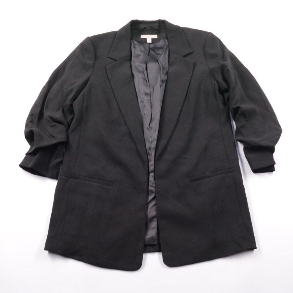 Женский пиджак H&M в чёрном цвете, прямого кроя с лацканами и карманами-«листочками». Подойдёт для офиса, собеседований и вечерних выходов, легко сочетается с платьем или джинсами. Плотная подкладка делает посадку аккуратной и комфортной в течение дня.