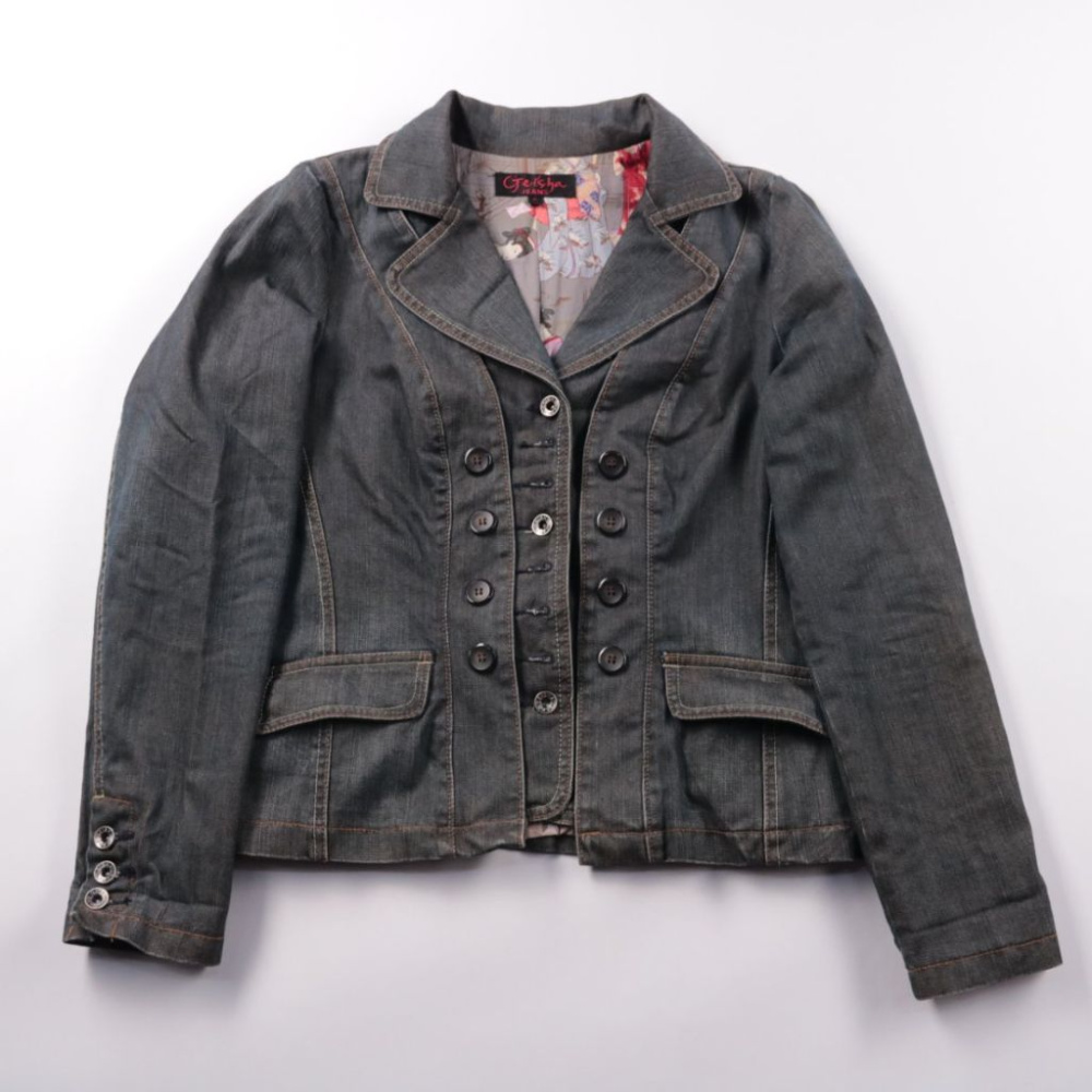 Джинсовый женский пиджак Geisha Jeans из хлопка, приталенный, с декоративной двойной линией пуговиц и отложным воротником. Подойдёт для повседневных образов в межсезонье с джинсами или платьем. Плотный деним держит форму и практичен в носке.
