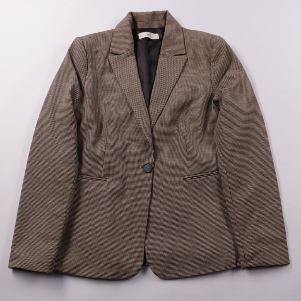 Женский однобортный пиджак MNG в мелкую клетку, приталенный силуэт, застёжка на одну пуговицу. Подойдёт для офиса и повседневных образов с джинсами или брюками. Практичный вариант: немаркий цвет и подкладка, удобно носить в прохладную погоду.