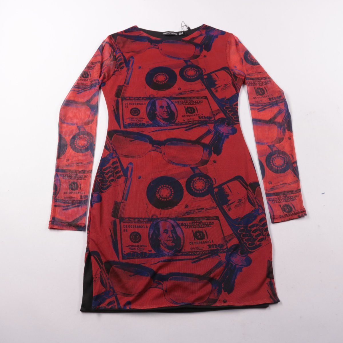 Повседневное облегающее платье PrettyLittleThing с длинным рукавом и ярким принтом в красно-синих тонах. Подойдёт для городских выходов и вечеринок, хорошо смотрится как самостоятельный акцент в образе. Эластичный материал тянется и комфортно садится по фигуре.