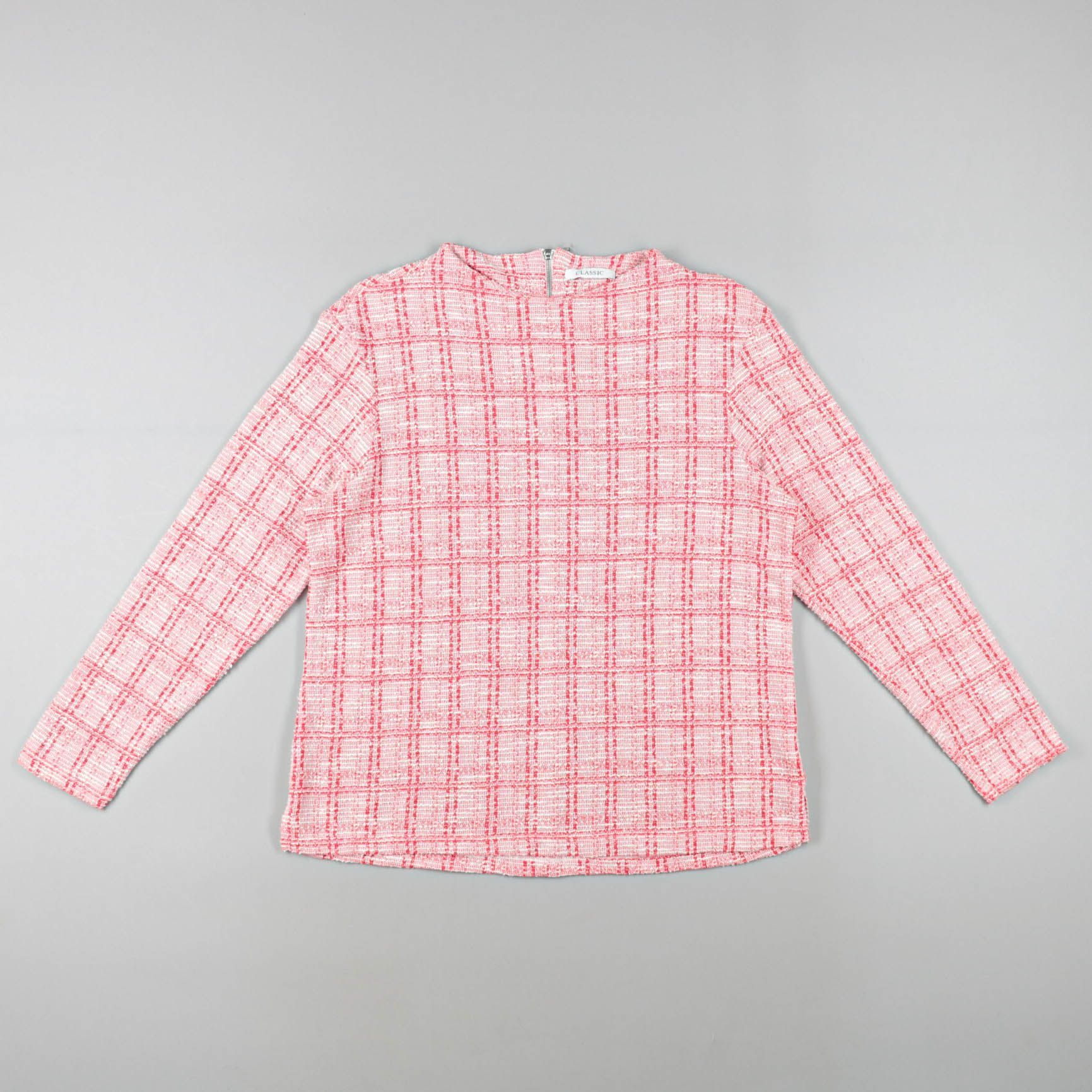 Блузка Classic из фактурной ткани в розово-белую клетку, с круглым вырезом и молнией на спинке. Подойдёт для офиса и аккуратных повседневных образов с брюками или юбкой. Плотный материал держит форму и выглядит собранно.