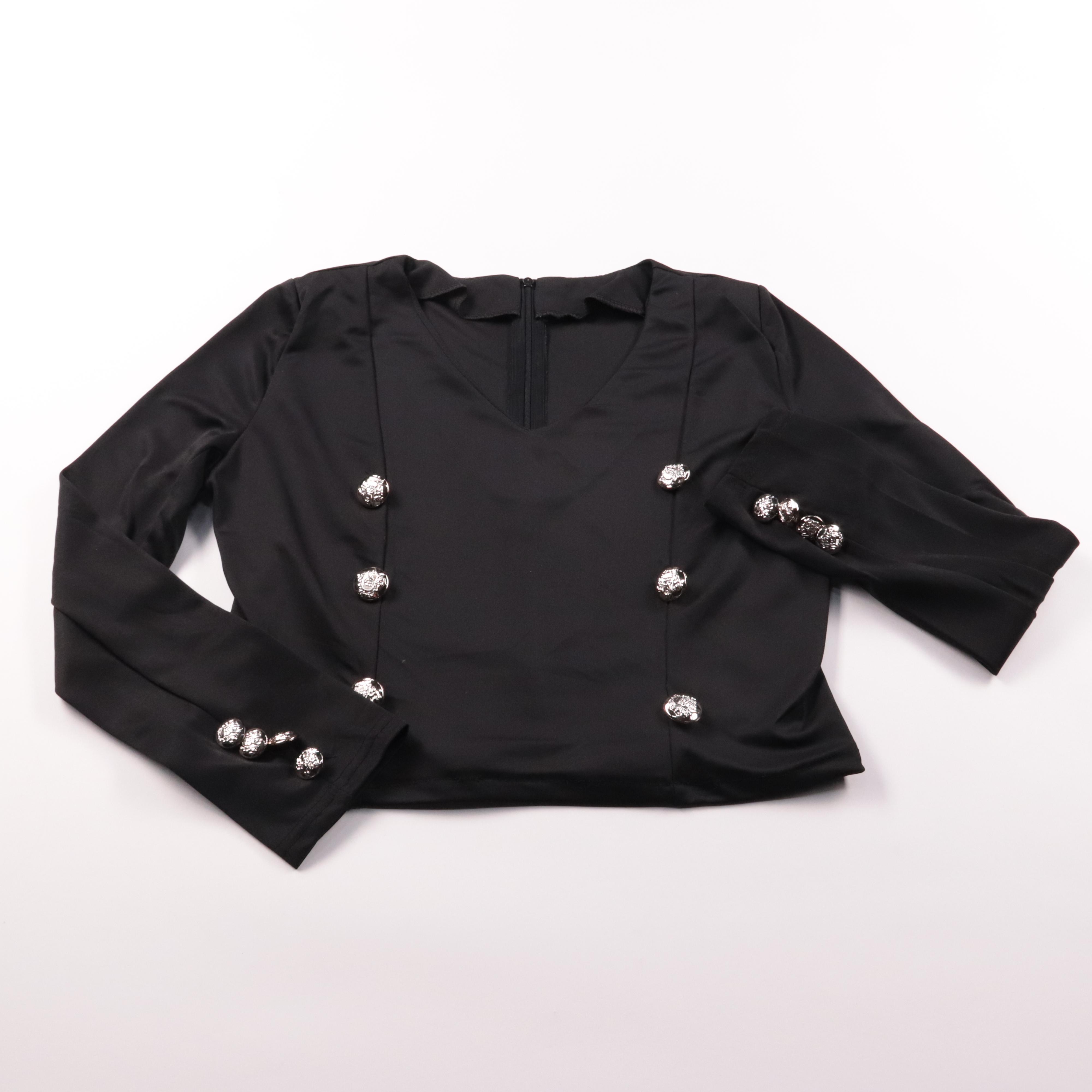 Чёрная блузка с V-образным вырезом и декоративными серебристыми пуговицами в стиле двубортного жакета. Подойдёт для офиса, мероприятий и вечерних выходов, хорошо сочетается с юбкой-карандаш или брюками. Практичный плюс — плотная ткань держит форму и не...