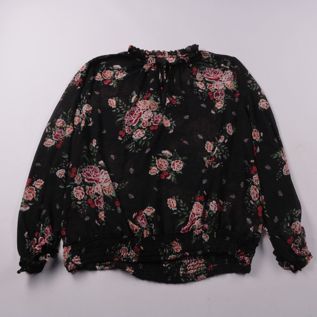 Блузка Peacocks из лёгкой ткани с цветочным принтом на чёрном фоне и длинными рукавами. Подойдёт для повседневных образов и офиса с однотонными брюками или юбкой. Эластичные манжеты и низ помогают посадке и не стесняют движения.