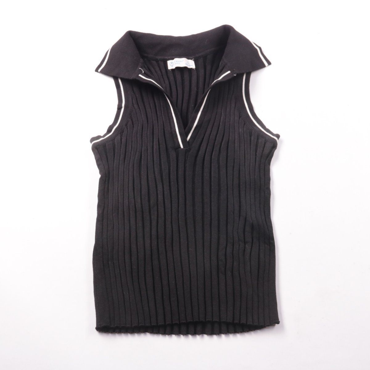 Трикотажный топ Primark в рубчик, без рукавов, с отложным воротником и белой окантовкой по краю. Подойдёт для летних образов и как базовый слой под жакет или кардиган. Эластичная вязка хорошо тянется и удобно садится по фигуре.