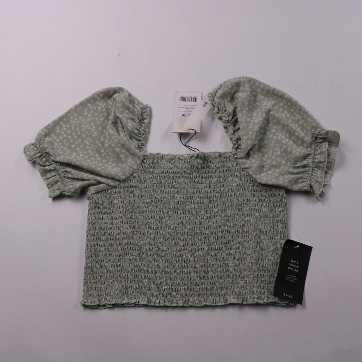 Кроп-топ NA-KD светло-зелёного цвета с мелким белым цветочным принтом, со сборкой-«смок» по корпусу и объёмными рукавами-фонариками. Подойдёт для летних образов с джинсами, шортами или юбкой. Эластичная сборка хорошо садится по фигуре и комфортна в носке.