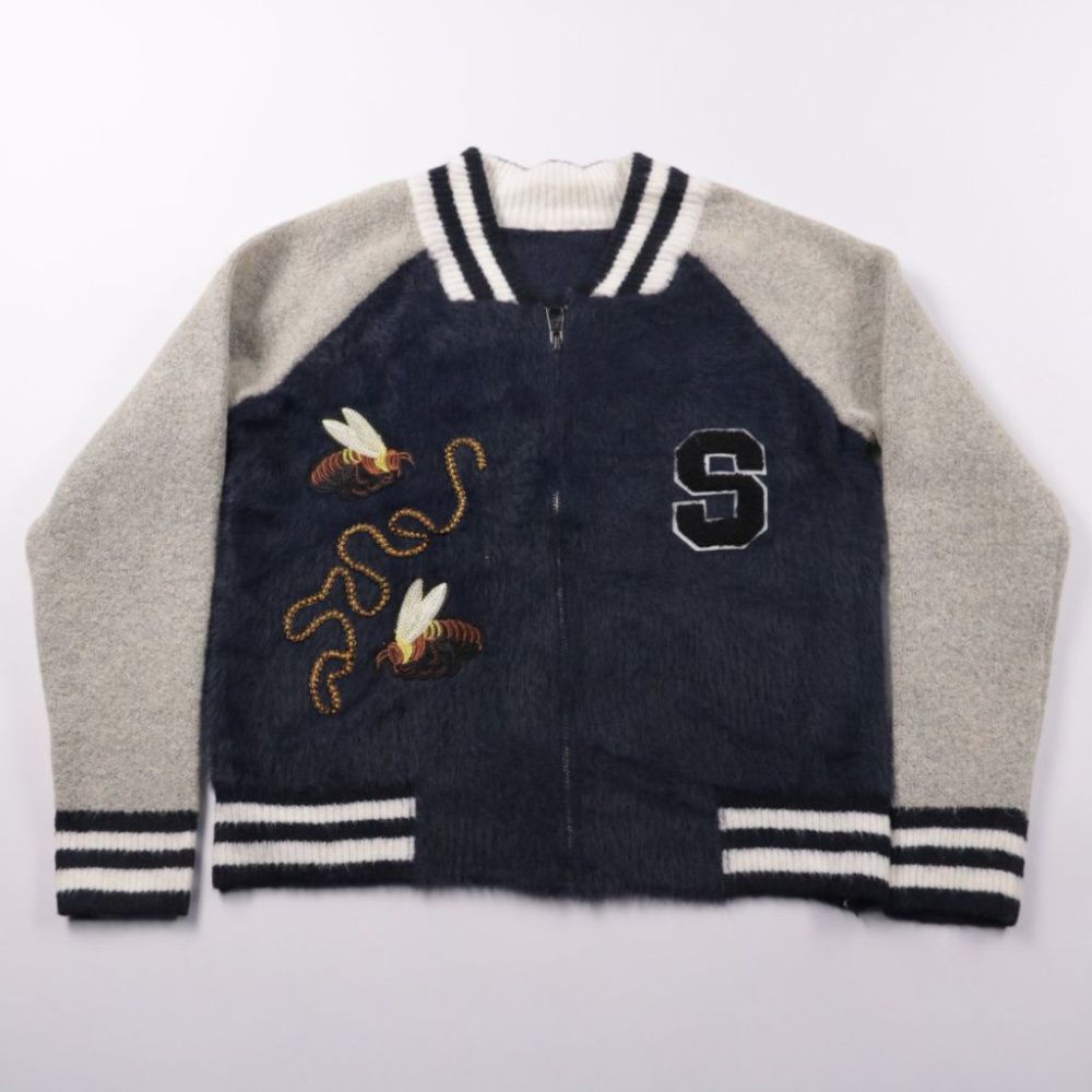 Бомбер без указанного бренда из мягкого ворсового трикотажа: тёмно-синий корпус и серые рукава, застёжка на молнии. Декор — нашивки/вышивка (буква «S», пчёлы и змея), подойдёт для повседневных образов в прохладную погоду. Практичный плюс — эластичные м...