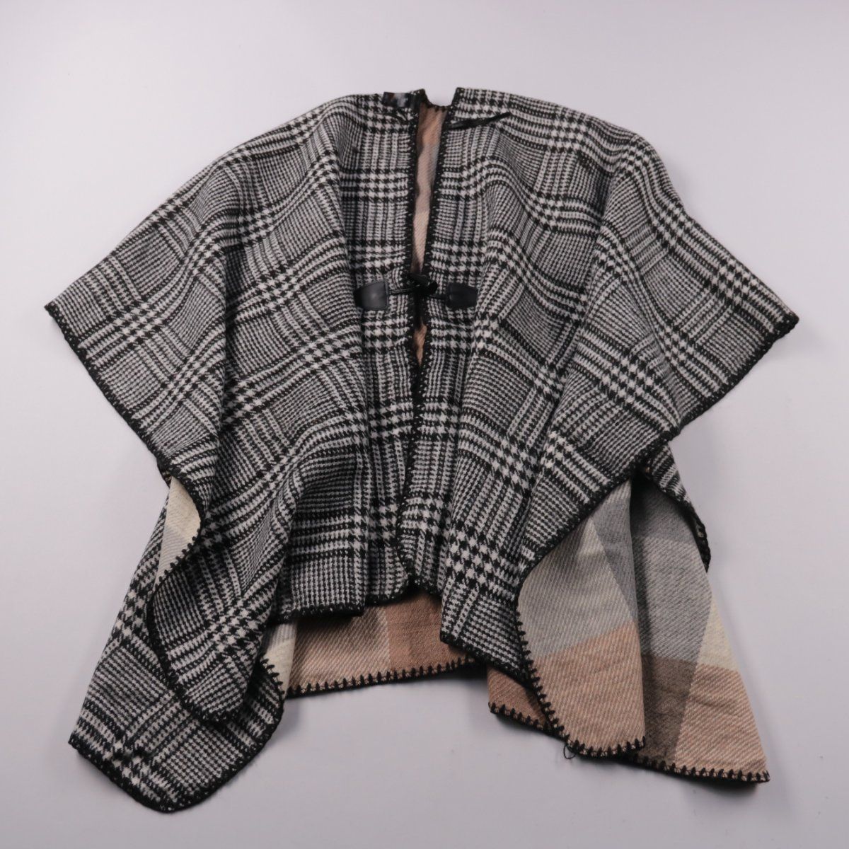 Пончо-накидка Tu в серо-чёрную клетку, двусторонняя (внутри бежево-коричневая клетка) с застёжкой на пуговицы. Подойдёт для прохладной погоды весной и осенью, удобно накидывать поверх свитера или водолазки. Практичный плюс — универсальный размер и можно носить разными сторонами.