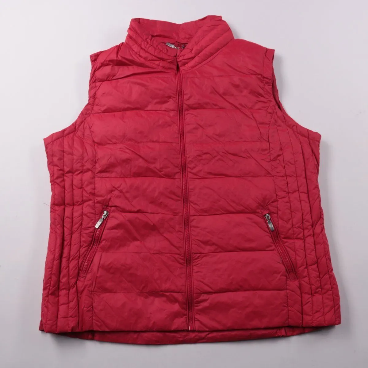 Стёганый женский жилет Real Fine красного цвета на молнии, с высоким воротником и боковыми карманами на молниях. Подойдёт для прогулок и поездок в прохладную погоду, удобно носить поверх худи или свитера. Лёгкий и не сковывает движения, при этом хорошо сохраняет тепло.